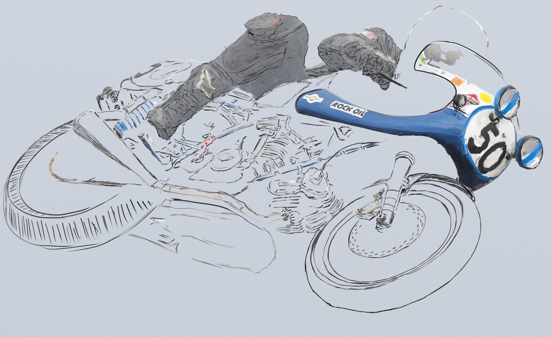 Drawing / study of the beautiful Ducati Desmo "Königswellen" engine. The engine was initially only roughly sketched in outline, although essential details such as the "Königswellen" should be recognizable.