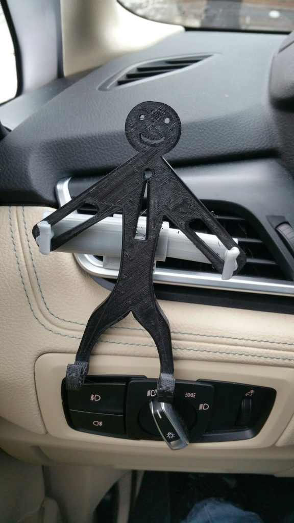 Bei #Thingiverse bin ich dann auch fündig geworden. Das ausgewählte Design besteht insgesamt aus 4 Teilen, ist sehr leicht zusammen zu setzen und erfüllt alle meine o.a. Anforderungen. Darüber hinaus sieht es auch noch nett aus bzw. ist über entsprechende Farbauswahl des Filaments dann farblich auch noch individuell an die eigenen Belange bzw. das farbliche Umfeld im Auto anpassbar. Weiterer Vorteil ist, dass alle Teile nur zusammen gesteckt sind und damit ganz einfach alles auch wieder demontiert werden kann, oder bspw. die Befestigung am Ventlationsschlitz mehrfach gedruckt werden kann und der Rest dann je nach Bedarf im Auto einfach umgehängt werden kann. In meinem BMW 225xe gibt es sowohl auf Fahrer- als auch Beifahrerseite seitlich jeweils Ventilationsöffnungen im Armaturenbrett, auch in der Mitte sind passende Öffnungen vorhanden. Werde mir daher die Befestigung direkt in entsprechender Menge drucken und an den Öffnungen dann anbringen, damit dann je nach Bedarf der Samrtphone-Halter an die verschiedenen Stellen im Auto angebracht werden kann.