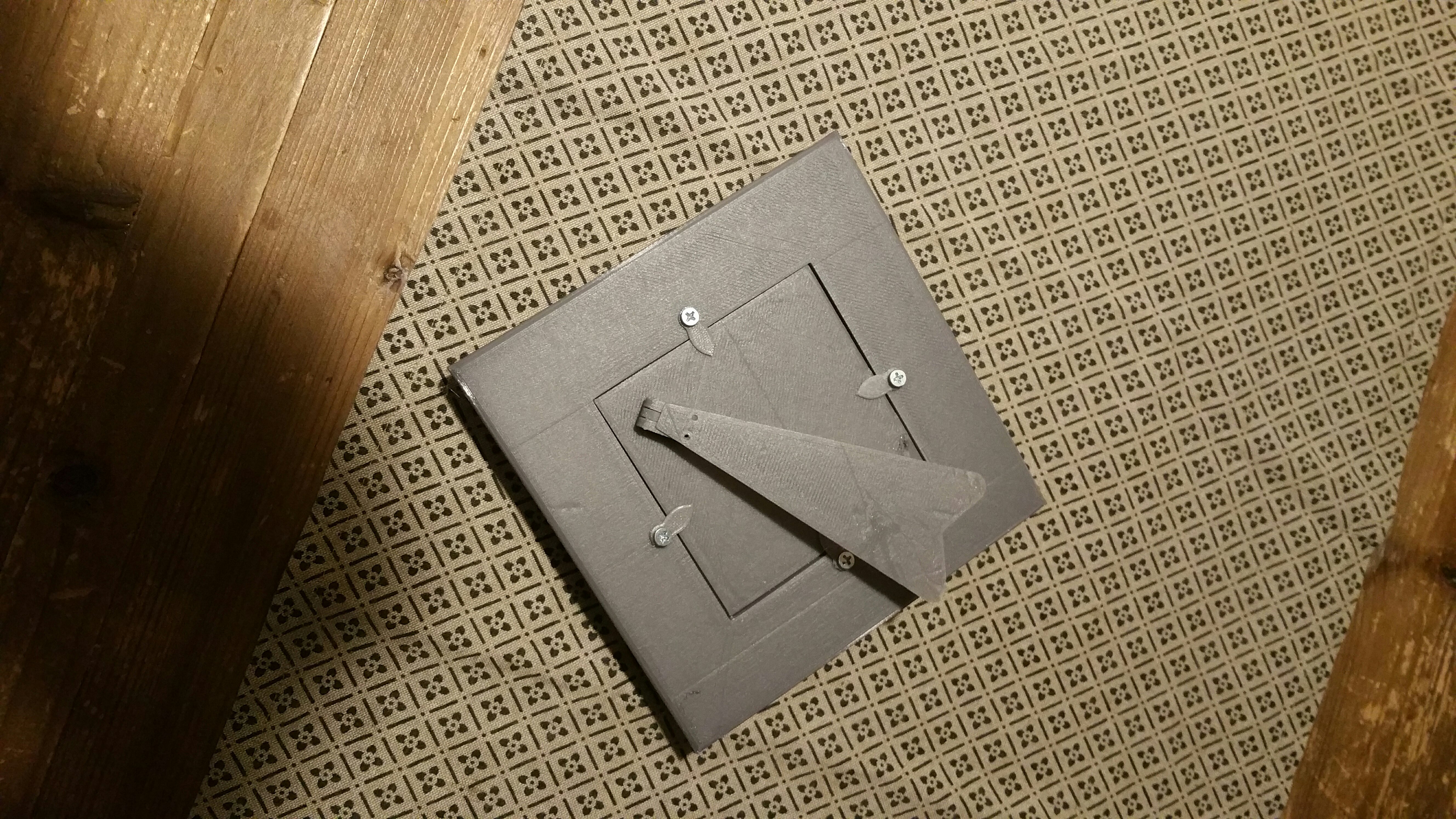 Ein kleines Scharnier, dass dann an den Aufsteller und die Rahmenrückseite angebracht werden kann.