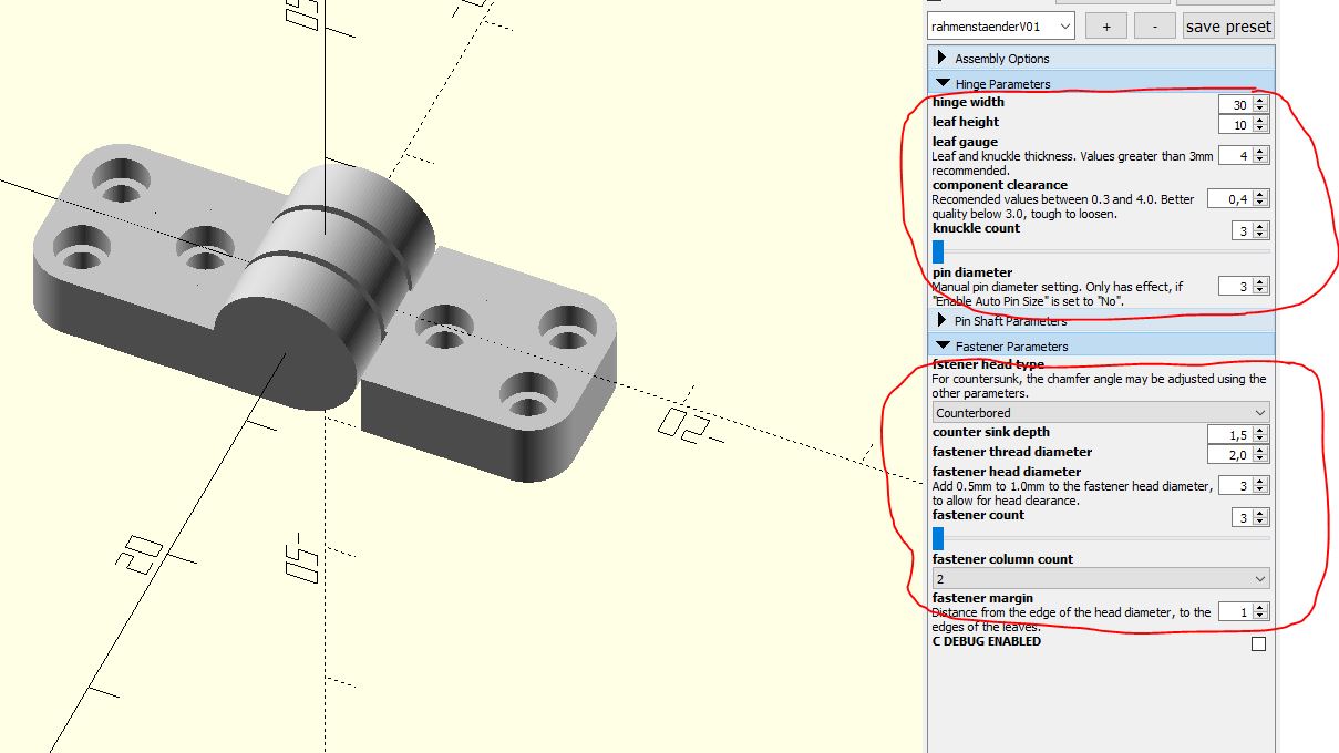 Dieses Scharnier kann über OpenSCAD beliebig nach den verschiedensten Kriterien konfiguriert werden und dann als STL- File erzeugt werden. Ich habe bei der Erzeugung zunächst folgende Parameter in OpenSCAD angegeben: