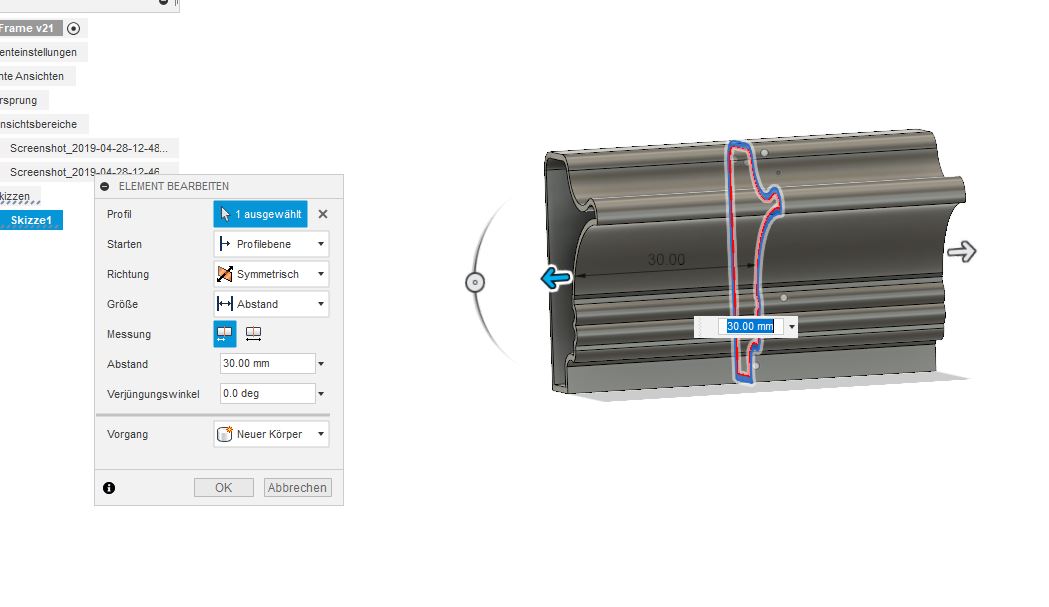 Die Extrusion des Profils wurde dann als symmetrische Extrusion mit jeweils 30mm ausgeführt: